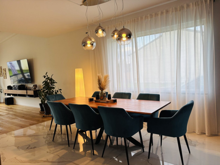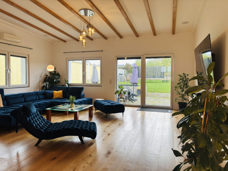 Mit einer großzügigen Wohnfläche von über 216 m² bietet dieses neuwertige Haus genug Raum für Ihre individuellen Gestaltungsmöglichkeiten. Die durchdachte Raumaufteilung umfasst insgesamt 6 Zimmer, die sich ideal für Wohn- und Arbeitsbereiche, Kinderzimmer oder Gästezimmer nutzen lassen. Die offene Wohnküche ist das Herzstück des Hauses, in dem Sie unvergessliche Momente mit Familie und Freunden verbringen können. Die DAN-Einbauküche ist nicht nur funktional, sondern auch stilvoll und mit vielen praktischen Elementen versehen (2 Backöfen, großes Kochfeld mit ausziehbarem Dunstabzug, Side-by-Side Kühlschrank mit Wasser- und Eiswürfelspender, etc.).