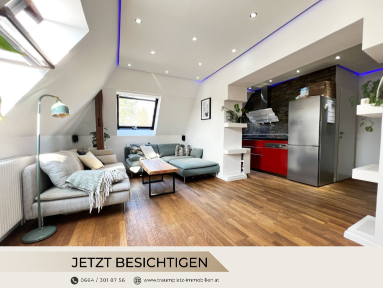 Obwohl die Wohnung keinen Balkon hat, fällt dies hier kaum ins Gewicht – die Raumaufteilung ist außergewöhnlich gut gelöst, der Wohn-Ess-Bereich wirkt durch die großen Dachflächenfenster extrem hell und offen, und das beeindruckende Spa-Badezimmer vermittelt durch seine großzügigen Glasflächen fast das Gefühl, in einem privaten Outdoor-Wellnessbereich zu stehen. Genau dieser Mix macht die Wohnung so charmant und besonders.
