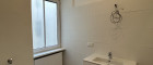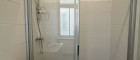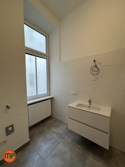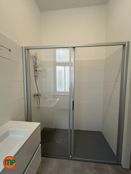 Das modern gestaltete Badezimmer überzeugt durch seine großzügige Raumaufteilung, eine elegante Walk-in-Dusche und ein Fenster mit Blick in den ruhigen Innenhof, das für viel Tageslicht sorgt. Direkt daneben befindet sich das separat gelegene WC, das ebenfalls neu und stilvoll gestaltet wurde.