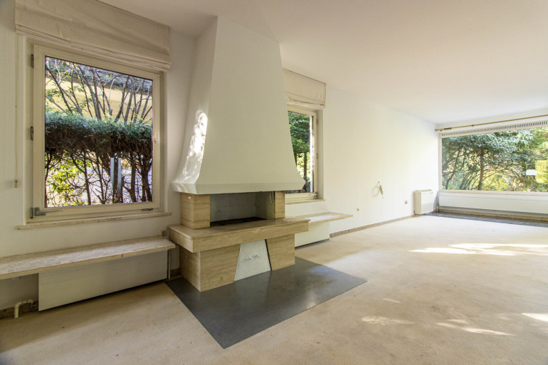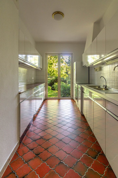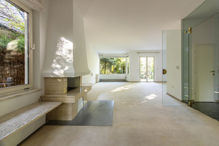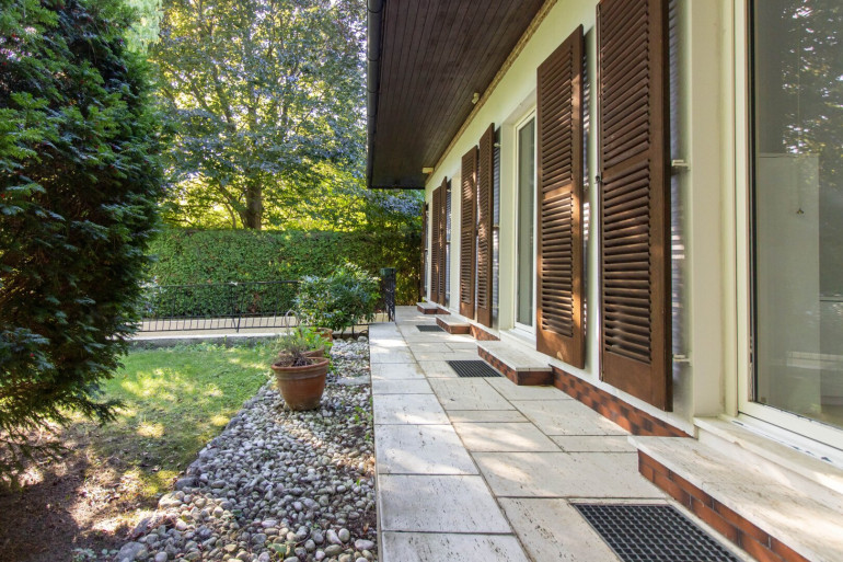 The living room and master bedroom are oriented toward the rear garden, facing the "Schreiberbach" stream, accessible directly from the property. The children’s bedrooms face south, overlooking the approximately 380 m² private and secluded front garden — a perfect outdoor retreat for play and relaxation.