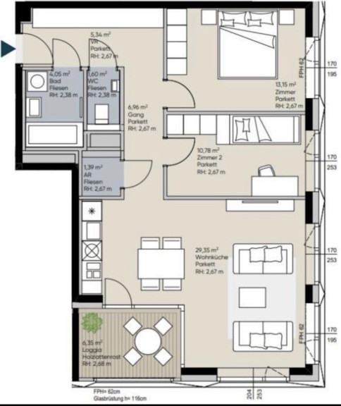 Die Wohnung besteht aus 3 Zimmern, mit knapp 73m² Wohnfläche sowie einer eigenen Loggia mit ca. 6m² undgliedert sich in folgende, funktionelle Raumaufteilung: