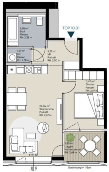 Die Wohnung besteht aus 2 Zimmern, mit knapp 49m² Wohnfläche sowie einer eigenen Loggia mit ca. 6m² undgliedert sich in folgende, funktionelle Raumaufteilung: