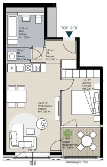 Die Wohnung besteht aus 2 Zimmern, mit knapp 49m² Wohnfläche sowie einer eigenen Loggia mit ca. 6m² undgliedert sich in folgende, funktionelle Raumaufteilung:
