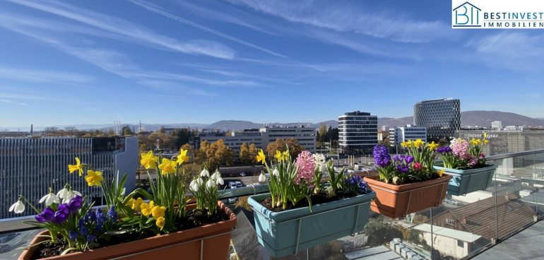 auf die herrliche Süd-Ost-Terrasse mit Blick über den Grazer Süden, 3 Schlafzimmer, Badezimmer mit Dusche UND Badewanne.