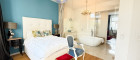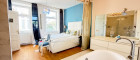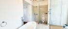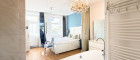 Stilvolles Badezimmer mit freistehender Badewanne, Dusche und Doppelwaschbecken – luxuriös wie im Boutique-Hotel