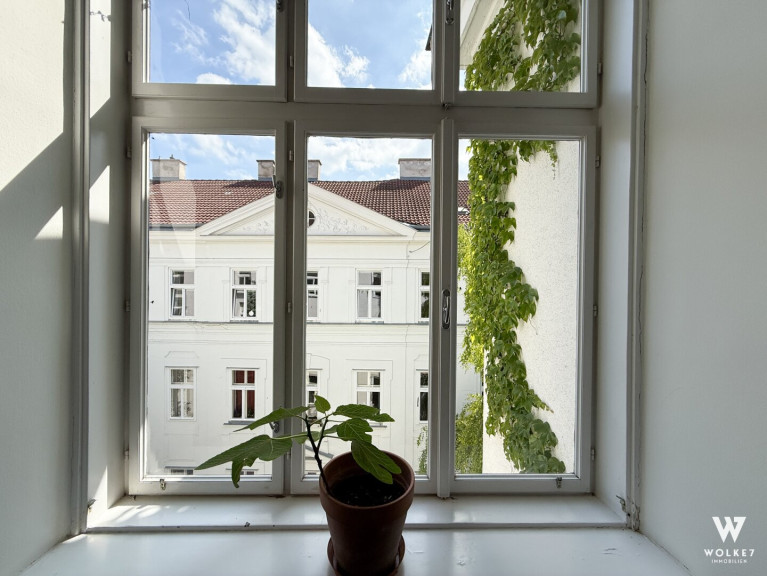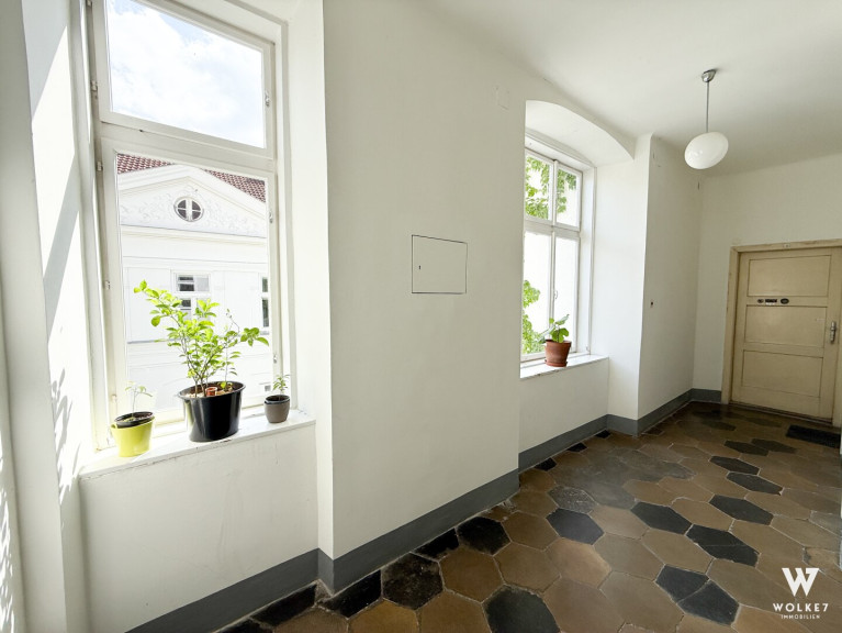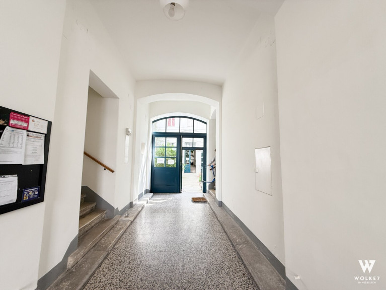 Das gepflegte, helle Stiegenhaus und der grüne Innenhof schaffen schon beim Eintreten ein angenehmes Wohngefühl.