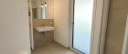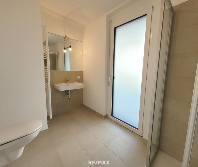 - Bad mit Dusche und WC, modern mit großen Fliesen und schönen Armaturen, Waschmaschinenanschluss