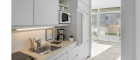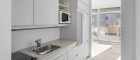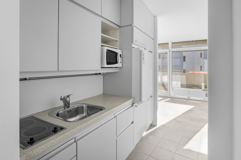 Die moderne Einbauküche lädt dazu ein, Pausen in einer angenehmen Atmosphäre zu verbringen, während der Personenaufzug den Zugang zum Bürokomfort für alle Mitarbeiter und Kunden erleichtert.