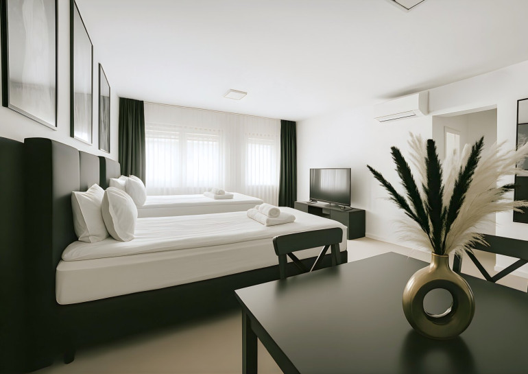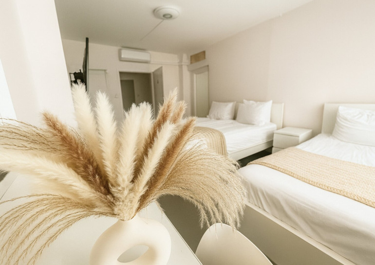 Ein paar Stufen höher öffnen sich zehn modern sanierte Zimmer, jedes mit eigenem Charakter. Einige mit Balkon, andere mit kleiner Gemeinschaftsküche – alle bereit, Gäste aus aller Welt willkommen zu heißen. Ideal für Airbnb oder eine kleine Pension mit Seele.