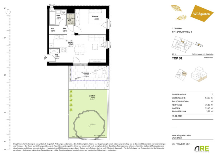 Sammeltiefgaragen mit Stellplätzen zur Miete sorgen für eine autofreie Zone an der Oberfläche. Gleichzeitig überzeugt der Wildgarten durch eine gute Infrastruktur und Verkehrsanbindung. Angebote des täglichen Bedarfs, wie Nahversorger (Billa), Gastronomie und Kindergärten, befinden sich direkt im Wohnquartier, öffentliche Verkehrsmittel, wie Bus (63A), sind in fußläufiger Nähe. Eine neue s-Bahn Station in der Benyastraße ist geplant.