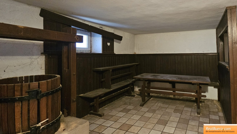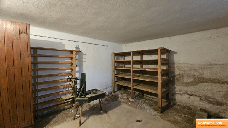 - 1. Kellerraum mit Handwaschbecken und einem Kachelofen sowie den Treppenaufgang in den Wohnbereich