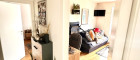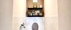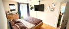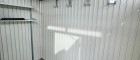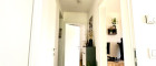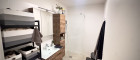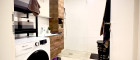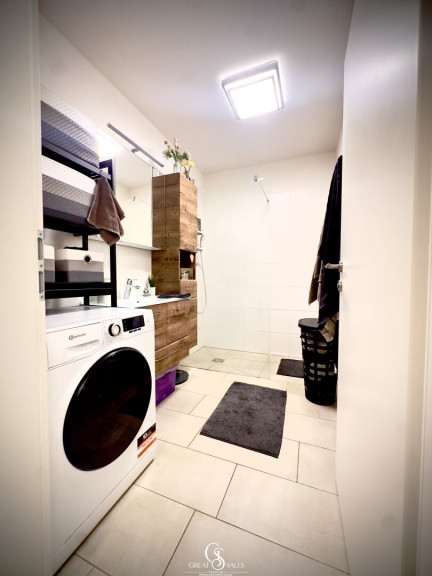 - Badezimmer mit Dusche, Waschbecken, elektrischen Handtuchwärmer und Waschmaschinenanschluss