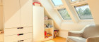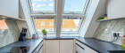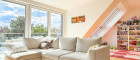 Durch die erhöhte Zwischenebene sind zwei weitere geschmackvolle Zimmer sowie ein hochwertig ausgestattetes Bad mit elektrischem Dachfenster erreichbar. Die durchdachte Architektur mit unterschiedlichen Ebenen schafft eine besondere Wohnatmosphäre: offen, hell und zugleich elegant gegliedert – ideal, um repräsentatives Wohnen und private Rückzugsorte zu vereinen.