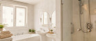 - Badezimmer mit Dusche, Badewanne, WC & Bidet (mit Fenster, Marmor)