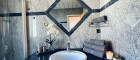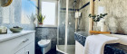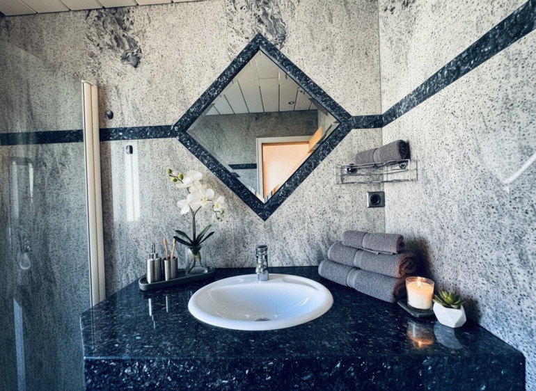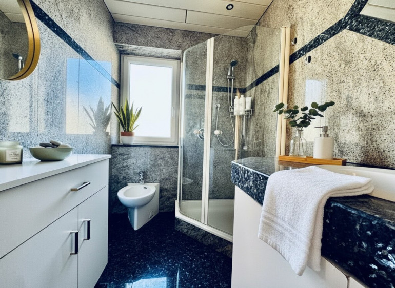 - Badezimmer mit Dusche, Bidet & hochwertiger Steinplatte