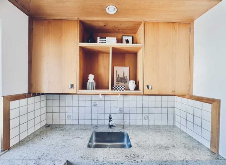 - Separate Küche aus Holz mit eleganter Steinarbeitsplatte
