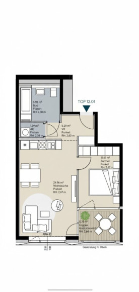 Top 90 ist die ideale Lösung für Paare oder junge Familien. Gleich beim Eingang befindet sich eine kompakte Garderobennische sowie separate Zugänge zum Badezimmer und zum Abstellraum. Vom Vorraum aus gelangt man in den luftigen Koch-/Wohnbereich, der vielfältige Einrichtungskonzepte erlaubt. Das separat gelegene Schlafzimmer bietet ausreichend Platz für ein Queensize-Bett und einen Einbauschrank. Die fast 6 m² große Loggia, die vom Wohnzimmer aus zugänglich ist, lädt dazu ein, Abende mit tollem Ausblick über Wien zu genießen.