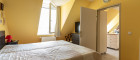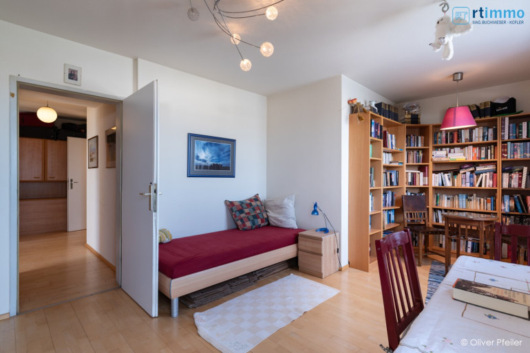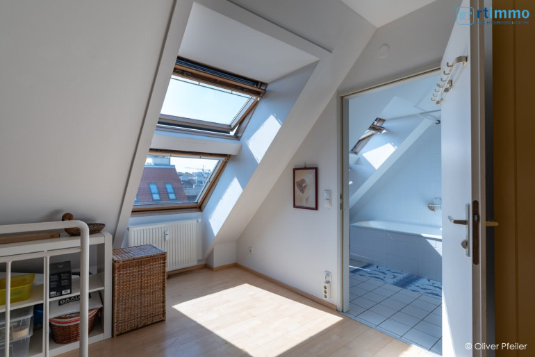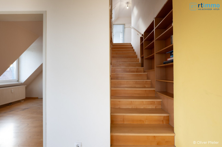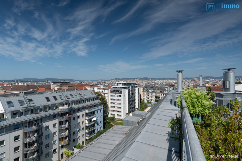 Die Wohnung betreten Sie durch einen Vorraum, um dann in den offenen und, auf Grund der Ecklage der Wohnung, gut strukturierten Wohn- und Essbereich zu gelangen, Etwas versteckt befindet sich der Küchenbereich, von dem man ins Schlafzimmer gelangt. Weiters gibt es noch einen großen Raum, der früher als Büro/Bibliothek genutzt wurde. Über eine Treppe gelangt man in die obere Etage der Wohnung. Hier hat man einen großzügigen Gangbereich, der viel Platz und Stauraum bietet. Von dort kommt man in ein großes Bad, welches aus zwei Bereichen besteht, einem mit Badewanne und einem mit Doppelwaschbecken und viel Platz für Waschmaschine und Trockner. In der oberen Ebene gibt es insgesamt drei Räume, mit Ausgang auf die große Dachterrasse, die einen Traumblick über ganz Wien bietet.