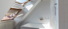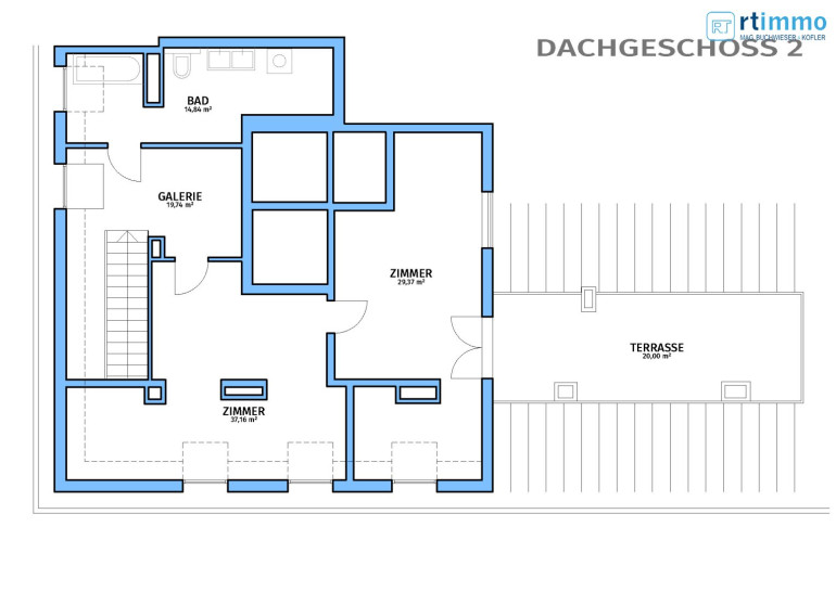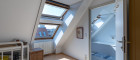 Wohnebene 2: 3 Zimmer, großes Wannenbad mit WC, Gangbereich mit viel Platz als Abstellfläche, Dachterrasse