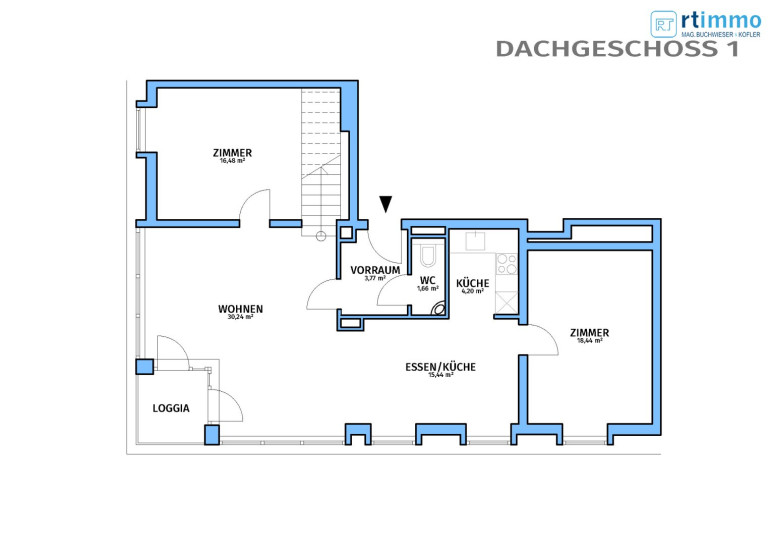 Wohnebene 1: Vorzimmer, Wohnesszimmer mit angeschlossenem (offenen) Küchenbereich und Loggia, Schlafzimmer, 1 Zimmer, WC, Abstellraum