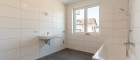 Das zeitlos gestaltete Badezimmer verfügt über eine Badewanne und Waschmaschinenanschluss, das separate WC befindet sich nebenan.