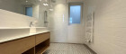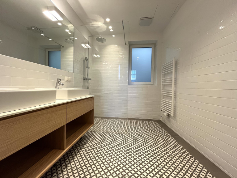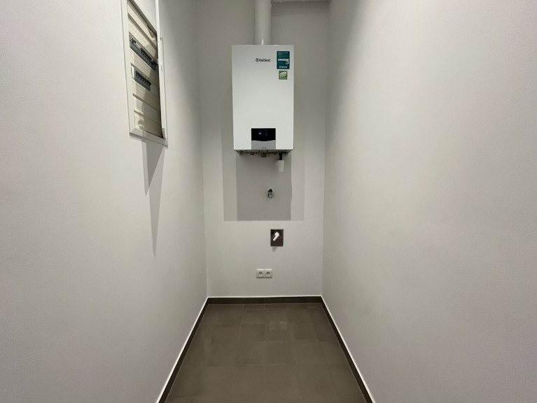 zentraler Vorraumbereich mit Zugang zur separaten Küche, zum Abstellraum mit Waschmaschinenanschluss, zum separaten WC mit Handwaschbecken sowie zum Hauptraum - dem Herz der Wohnung - der offene Wohnbereich. Der Schlafbereich ist durch eine Trennwand vom großzügigen Wohnbereich abgetrennt. Vom Schlafbereich aus gelang man durch einen Schrankraum in das Badezimmer en suite mit Dusche, Doppelwaschtisch, Handtuchheizung und Fenster.