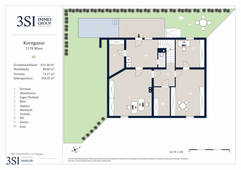 Über eine Treppe gelangen Sie in den vielseitigen Wohnkeller: Ob als zusätzliches Büro, Gästezimmer oder kleine Werkstatt – hier haben Sie Platz für Ihre Ideen. Auch von hier betreten Sie den Garten, wo Sie der großzügige Pool mit Gegenstromanlage erwartet. An warmen Sommertagen bietet er Erfrischung, Badespaß und entspannte Stunden mit Familie und Freunden.