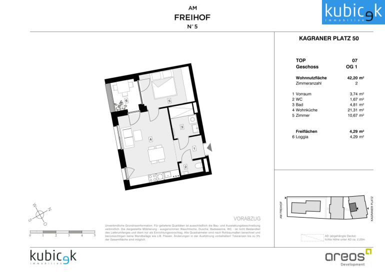 Das Projekt Am Freihof 5 / Kagraner Platz 50 vereint die Vorzüge urbanen Wohnens mit der Nähe zur Natur. Mit exzellenter Verkehrsanbindung, umfassender Infrastruktur und einem vielfältigen Freizeitangebot bietet dieser Standort alles, was modernes, komfortables und nachhaltiges Stadtleben auszeichnet. Ein Ort, an dem sich Lebensqualität, Mobilität und Erholung harmonisch verbinden – ein Zuhause mit Zukunft.