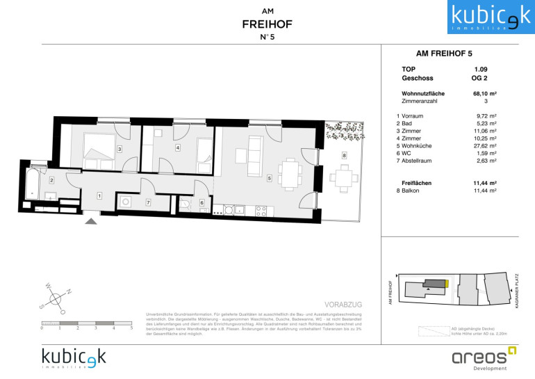 Das Projekt Am Freihof 5 / Kagraner Platz 50 vereint die Vorzüge urbanen Wohnens mit der Nähe zur Natur. Mit exzellenter Verkehrsanbindung, umfassender Infrastruktur und einem vielfältigen Freizeitangebot bietet dieser Standort alles, was modernes, komfortables und nachhaltiges Stadtleben auszeichnet. Ein Ort, an dem sich Lebensqualität, Mobilität und Erholung harmonisch verbinden – ein Zuhause mit Zukunft.