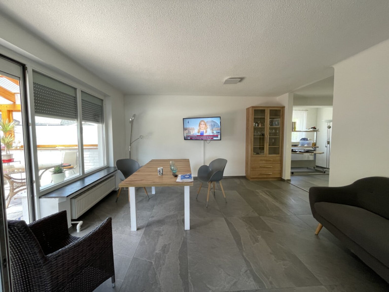Gesamt 8 Räumen, 1 Heizraum ausgestattet mit Gas und Stückgut, großzügige Garagenflächen und Aufenthaltsbereich. Auch von dieser Ebene ist ein separater Garten mit überdachtem Sitzbereich erreichbar. Von dort führt ein Aufgang zum Wintergarten des Wohnbereiches im Erdgeschoss.
