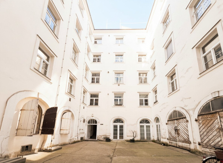 Der Innenhof ist dann im Gegensatz dazu schon ein typischer Altbau Innenhof, in dem wohl ehemalige Stallungen gewesen sein könnten. Das Haus selbst, die Stiege 2, versprüht Altwiener Charme mit dicken Mauern, Stiegen, die schon viel gesehen haben und Bassena am Gang. Auch die zeitgenössischen Fenster in der Wohnung, das Fischgrätparkett und die 3 Meter hohen Räume passen dazu wie die "Faust aufs Auge".
