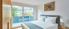 Im Obergeschoss befinden sich drei Schlafzimmer, alle mit Zugang ins Freie – zwei auf den Westbalkon, eines auf die Dachterrasse mit Whirlpool. Das stilvolle Badezimmer verfügt über Dusche und Fenster.