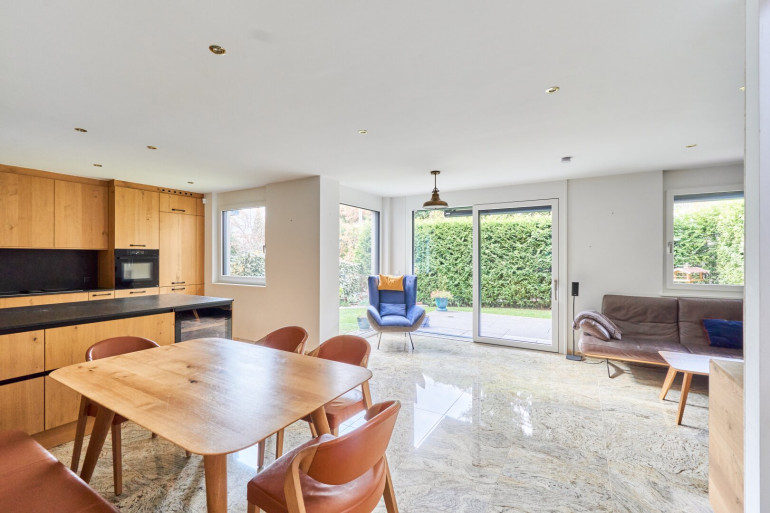 Das Haus begeistert mit einer großzügigen Wohn-/Essküche samt Stein-Arbeitsplatte, Zugang zum sonnigen Westgarten sowie einem zusätzlichen Raum im Erdgeschoss, der sich perfekt als Büro oder Fitnessraum eignet. Eine Tagestoilette mit Fenster ergänzt das Erdgeschoss.