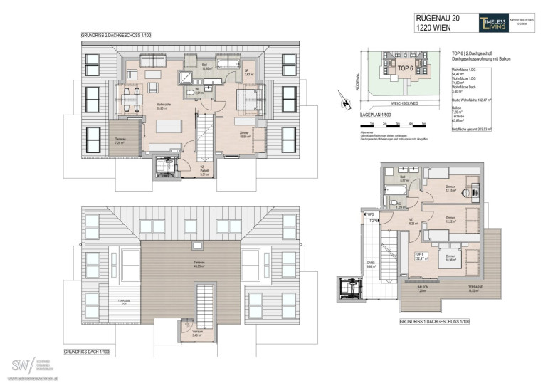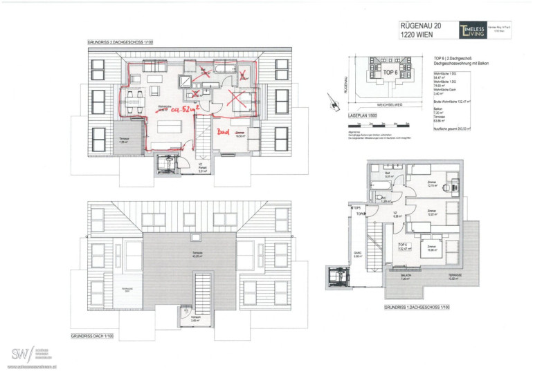 Ein offener Wohn- und Essbereich mit rund 52 m², fließend verbunden mit einer weiteren Terrasse und der großen Dachterrasse. (Planänderung siehe "Rügenau_Top6_Skizze)