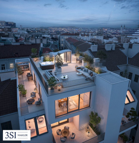 Erleben Sie exklusives Wohnen auf höchstem Niveau: Diese außergewöhnliche Dachterrasse mit beeindruckenden 122 m² Fläche eröffnet Ihnen einen atemberaubenden Panoramablick über die Skyline Wiens – von den historischen Bauten der Innenstadt bis zu den grünen Hügeln am Stadtrand.