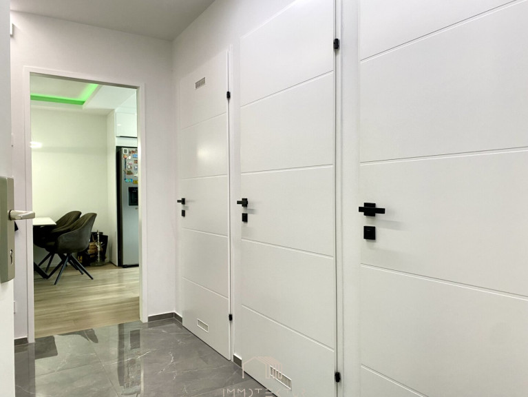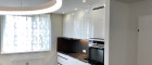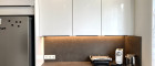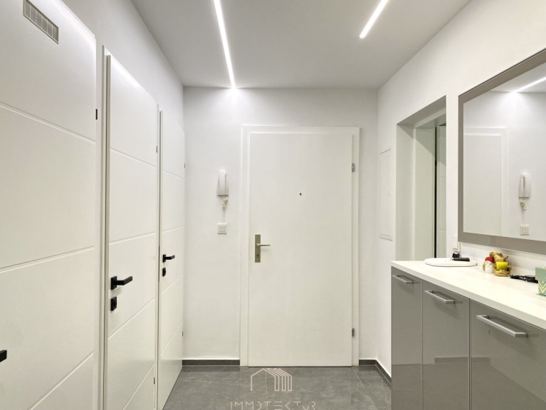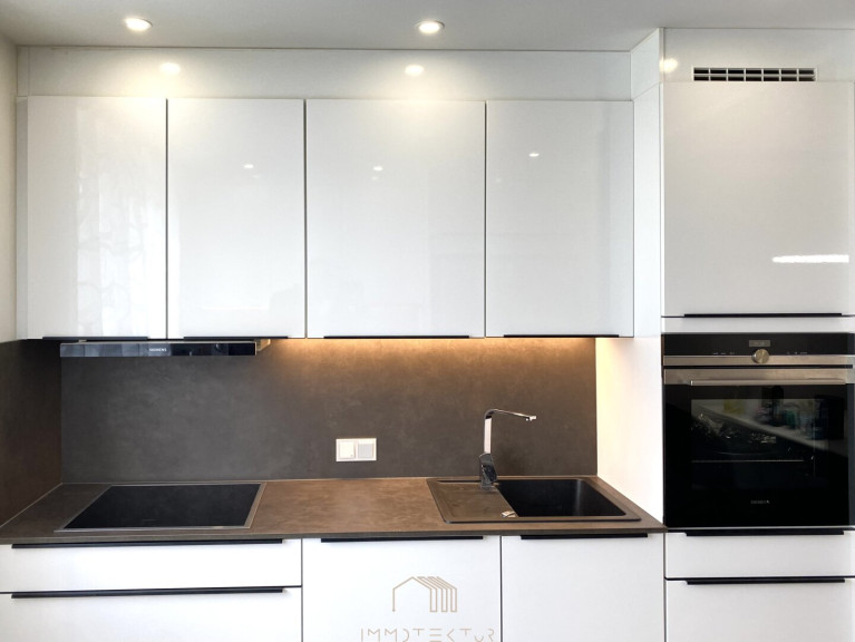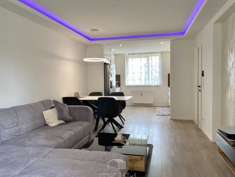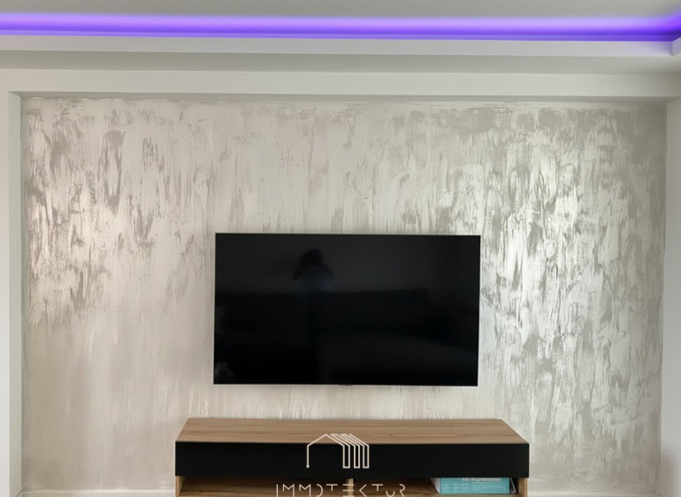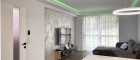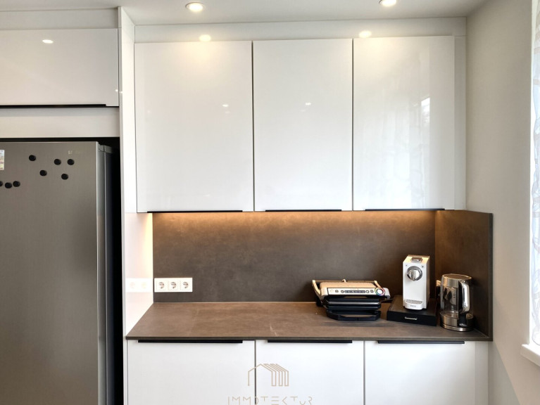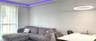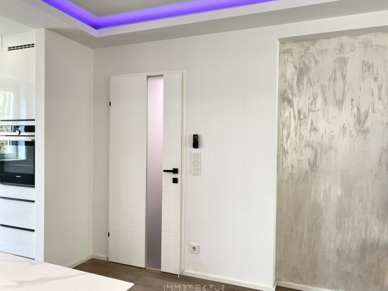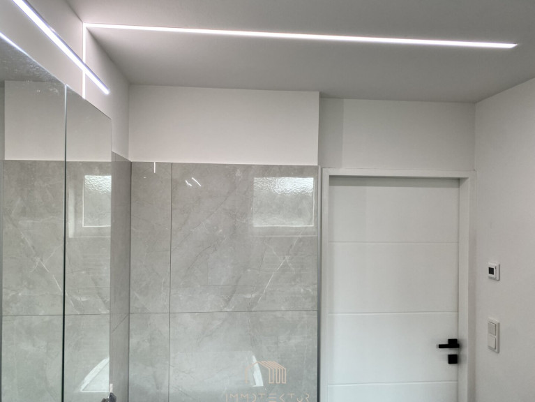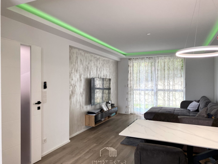 Die elegant abgehängte Decke mit integrierter Beleuchtung unterstreicht den modernen Charakter und schafft ein stilvolles Wohnambiente.