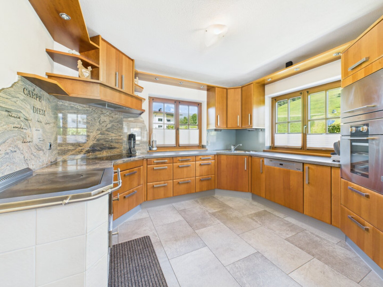 Parkett, Dielenboden, Fliesen, Elektro, Gas, Fußbodenheizung, Kamin, Einbauküche, Nordbalkon, Westbalkon, Bad mit Fenster, Badewanne, Dusche, Garage