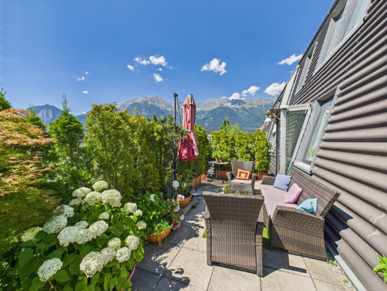Das absolute Highlight ist die rund 41,82 m² große Südwest-Terrasse, die einen beeindruckenden Panoramablick auf die Basilika Wilten, die Bergisel-Sprungschanze sowie die Nordkette eröffnet – ein einzigartiges Innsbrucker Stadtpanorama, das zu jeder Tageszeit begeistert.