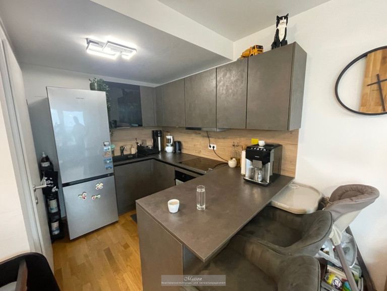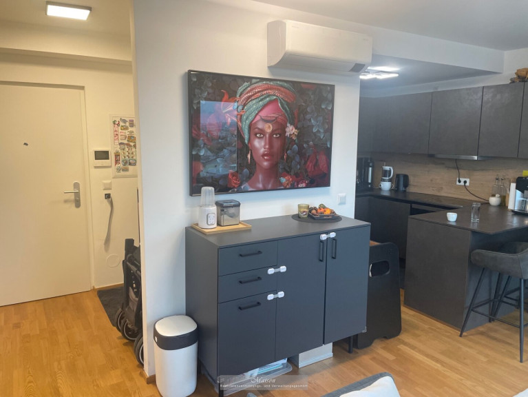 Die Wohnung ist mit hochwertigen Materialien ausgestattet, darunter stilvolle Fliesen und warmes Parkett, das für ein angenehmes Raumklima sorgt. Die Fußbodenheizung sorgt für wohlige Wärme in der kalten Jahreszeit und macht das Wohnen besonders komfortabel. In den heißen Jahreszeiten stehen 2 Klimaanlagen zur Verfügung. Die offene Wohnküche ist ideal für gesellige Abende mit Freunden oder romantische Dinner zu zweit. Ein Fliesenbad mit Walk-Inn-Dusche, separate Toilette mit Handwaschbecken und ein Abstellraum mit Waschmaschinen-Anschluss runden das Angebot ab.