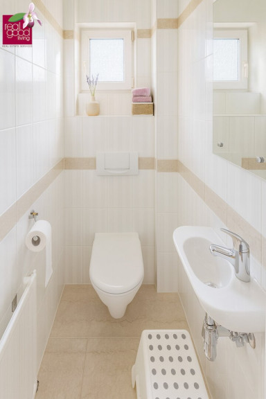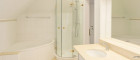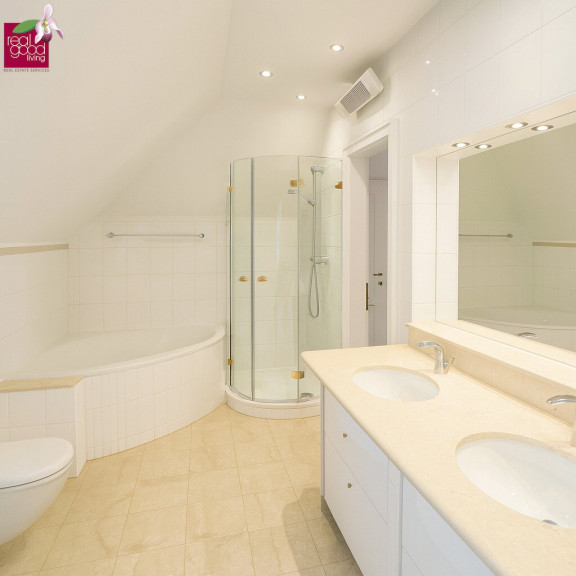 Zwei stilvolle Badezimmer mit Doppelwaschbecken, Badewanne & Dusche