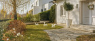 Liebevoll gestalteter Eingangsbereich mit Blumenbeeten