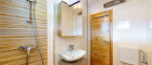 Beim Betreten gelangt man in einen hellen Eingangsbereich, der in einen zweiten Flur übergeht. Von hier aus sind das moderne Badezimmer, das erste Schlafzimmer sowie der offene Wohn- und Essbereich bequem erreichbar. Das Badezimmer wurde mit zeitlosen hellen Fliesen gestaltet; im Duschbereich setzen Holzfliesen warme Akzente. Die Sanitärausstattung zeigt sich in einer eleganten Kombination aus Holzoptik und Weiß.