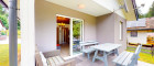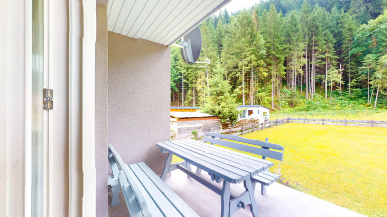 Die teilüberdachte Terrasse (10,3 m²) ist mit feinsteinzeuggrauen Fliesen ausgestattet und verfügt über eine massive Sitzgarnitur sowie ein Loungesofa. Dieser Außenbereich erweitert die Nutzfläche und eignet sich bestens zur Vermietung als beliebter Aufenthaltsraum im Sommer wie im Übergangszeitraum.