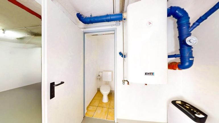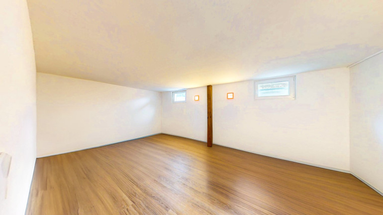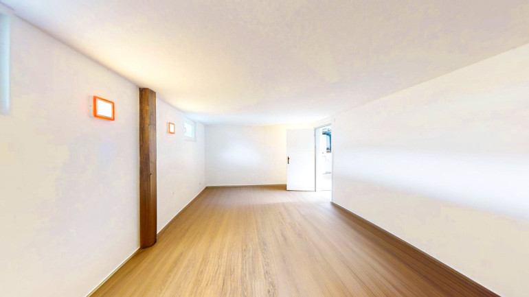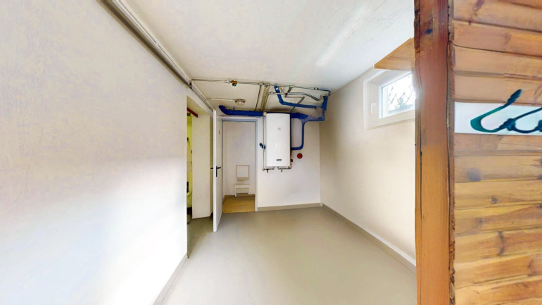 Der Zugang zum trockenen Kellergeschoss erfolgt über einen überdachten Treppenabgang. Der Keller beherbergt ein Holzlager, einen großzügigen Partyraum mit hellem Holzboden, einen Waschraum, ein WC (braune Fliesen) sowie einen größeren Vorraum, der als Lager genutzt wird. Der Estrichbereich ist fachgerecht mit spezieller Kellerfarbe versehen. Der Keller bietet Potenzial zur Umnutzung als Wohnkeller oder als zweite abgeschlossene Vermieteinheit — ideal für Investoren, die ein Renditeobjekt Bodental suchen.