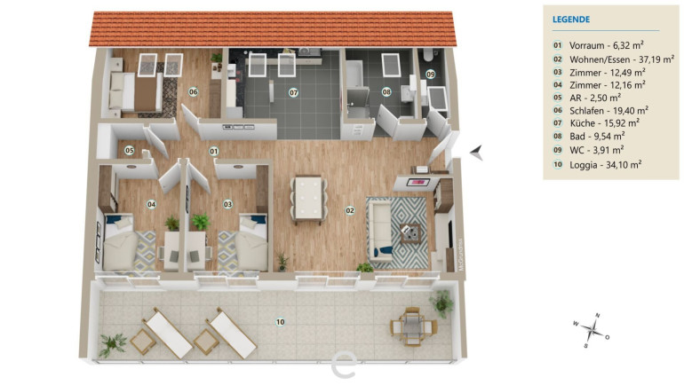 Das Herzstück ist der großzügige Wohn- und Essbereich mit offen integrierter Küche – ein Ort, an dem man gerne zusammenkommt. Von hier aus öffnet sich die südlich ausgerichtete Loggia - sonnig, ruhig und mit Blick in die umliegende Natur. Ein Rückzugsort, der wie ein zweites Wohnzimmer im Freien wirkt. 3 Schlafzimmer schaffen Platz für Familie, Gäste oder Homeoffice. Das moderne ausgestattete Badezimmer mit Badewanne und Dusche, ein separates WC und ein praktischer Abstellraum ergänzen den hohen Wohnkomfort.