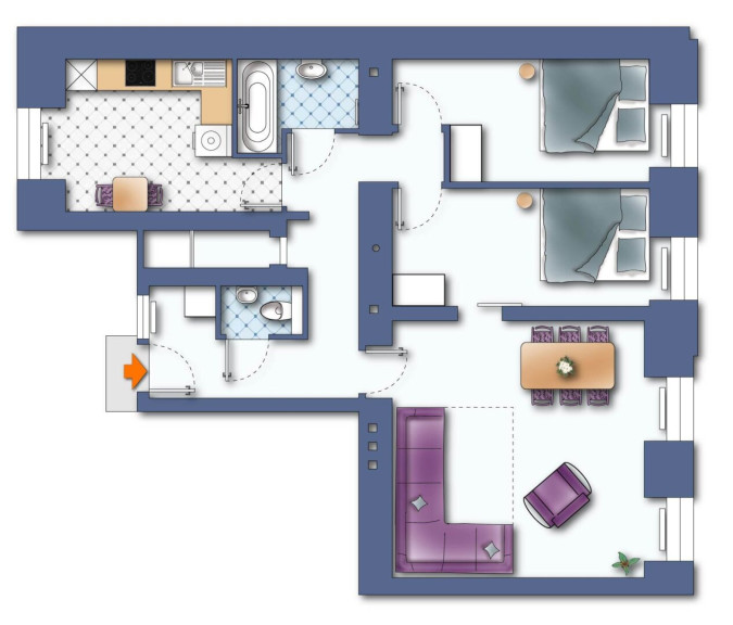 This inviting apartment offers two well sized bedrooms, a bright and spacious living room, and a separate kitchen equipped with all appliances. The bathroom has a bathtub and washbasin, and the toilet is located in a separate room. A washing machine is also available.