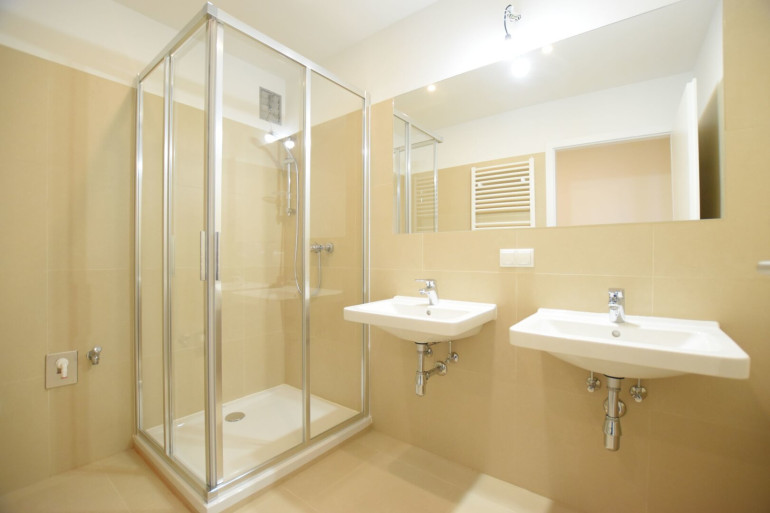 Das Badezimmer wurde ebenfalls erneuert und mit einem Doppelwaschtisch, einer Duschkabine sowie einem Waschmaschinenanschluss ausgestattet.