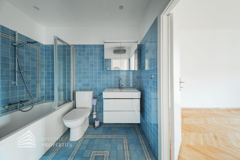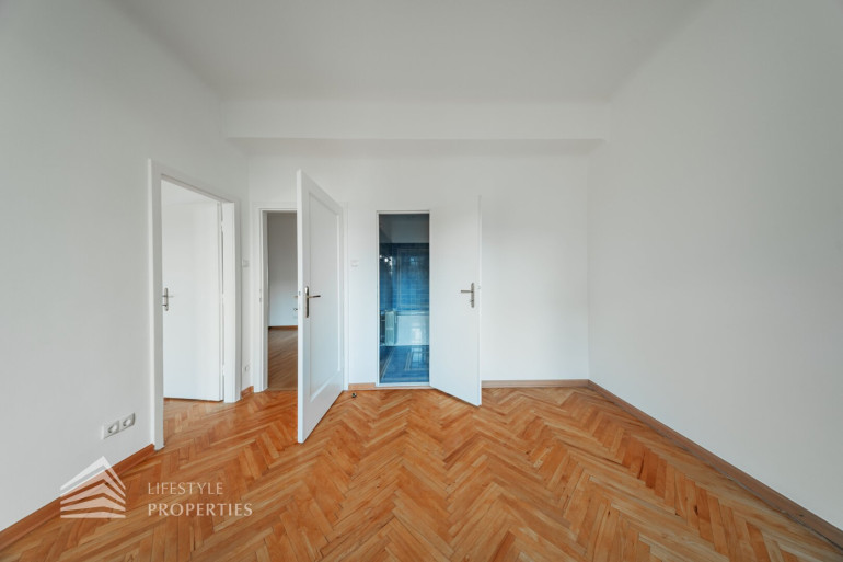 Straßenseitig befinden sich zwei Schlafzimmer, ein ca. 14 m² großes Zimmer, ideal als Kinder-, Gäste- oder Arbeitszimmer, sowie ein großzügiges ca. 19 m² Hauptschlafzimmer, welches über einen direkten Zugang zum Badezimmer verfügt. Das modernisierte Badezimmer ist sowohl vom Hauptschlafzimmer als auch vom zentralen Vorraum aus begehbar und mit Badewanne und WC ausgestattet. Zusätzlich steht ein separates Gäste-WC zur Verfügung.