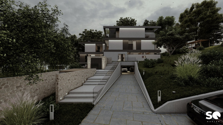 Die großzügige Garage im Untergeschoss der Villa bietet Platz für 4 PKW und ist direkt von der Kahlenberger Straße per Zufahrt zugänglich. Ebenso der einladend gestaltete Haupteingang.