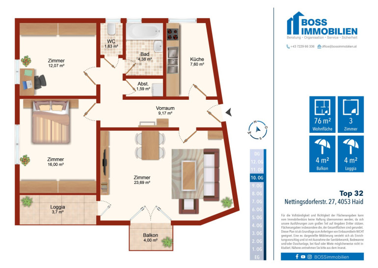 Der durchdachte Grundriss verbindet ein großzügiges Wohnzimmer mit Essbereich und direktem Zugang zu Loggia und Balkon mit zwei gemütlichen Schlafräumen und einer voll ausgestatteten Küche. Ein einladender Vorraum mit Garderobe, ein separates WC, ein tageslichtdurchflutetes Badezimmer sowie eine kompakte Abstellkammer mit Waschmaschinenanschluss sorgen für Komfort und praktische Abläufe im Alltag. Die Fenster der Wohn- und Schlafräume sind mit Außenrollos ausgestattet, teilweise auch elektrisch bedienbar.